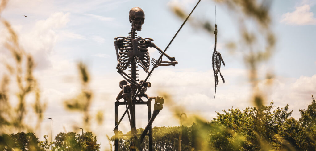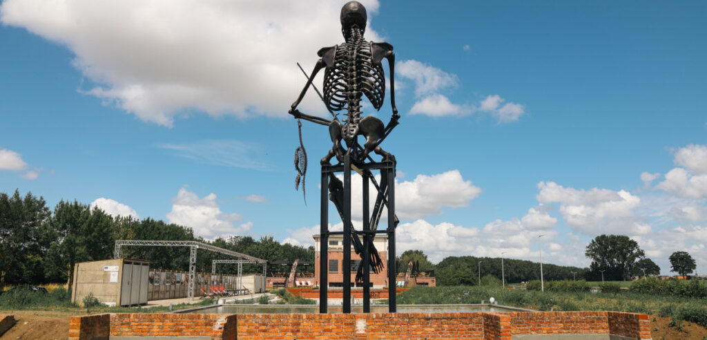 De 10 meter hoge sculptuur The Fisherman van de Truiense kunstenaar Tom Herck vormt letterlijk het hoogtepunt van zijn artistieke project Once We Ruled The World. Het werk stond vorig jaar nog opgesteld langs het historische Canal Grande tijdens de 60ste editie van de Biënnale van Venetië. “Met Once We Ruled The World creëerde ik een reeks monumentale installaties waarin menselijke en dinosaurusskeletten worden verweven als verkenning van het menselijke ego en ijdelheid”, aldus de kunstenaar. “Dinosaurussen nemen een prominente plaats in de geschiedenis van de aarde in. Dit in contrast met de relatief jonge Homo sapiens, die slechts 300.000 jaar geleden ontstond.” Het uitsterven van niet-vliegende dinosaurussen 66 miljoen jaar geleden maakte de weg vrij voor zoogdieren en uiteindelijk voor mensen. Ondanks het gebrek aan fysieke kracht in vergelijking met dinosaurussen domineren mensen als toppredators dankzij geavanceerde cognitieve vermogens, gereedschappen en sociale structuren. Herck reflecteert op het menselijke ego, de ijdelheid en evolutie van de mensheid te midden van de digitale revolutie. The Fisherman biedt een speculatieve weergave van co-existentie in de 21e eeuw. Hierin ontvouwt zich een symbolisch verhaal waarin een representatie van het menselijke ego onconventioneel naar een Plesiosaurus hengelt. De combinatie van oude en hedendaagse elementen – zoals het gebruik van een USB-kabel voor het vissen – dient als een aangrijpend commentaar op de oprukkende digitale revolutie en de mogelijke opkomst van nieuwe mensensoorten, wat uiteindelijk de heerschappij van de Homo sapiens uitdaagt. De introspectie van de kunstenaar is duidelijk in de exacte replicatie van zijn eigen schedel, wat aanzet tot diepere reflectie over thema’s als ijdelheid en vergankelijkheid, niet enkel van de menselijke soort maar ook specifiek van de kunstenaar persoonlijk, en de artiest in het algemeen.